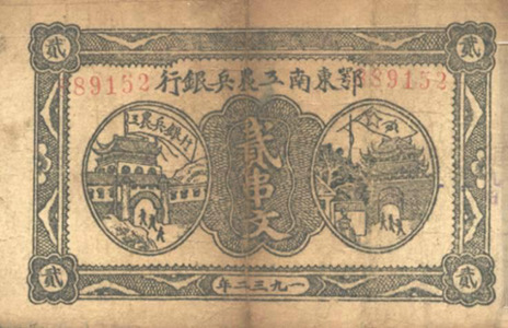 鄂豫皖革命根據地是在1927-1929年期間鄂東北的黃麻起義、豫東南的商南起義、皖西的六霍起義等基礎上,創立的在鄂豫皖三省邊界以大別山為中心的革命根據地。1930年10月,鄂豫皖特區蘇維埃銀行在七里坪成立,其職能主要是通過借貸、儲蓄、兌換等業務工作,籌集資金,幫助根據地的人民發展工、農、商業。對于農民用于購置耕牛、農具、種子的貸款,一律免息,其余貸款酌量收息。銀行還發行過多種面值的紙幣、布幣、銅幣、銀元和“經濟公社流通券”(購油、布等物的憑證)。