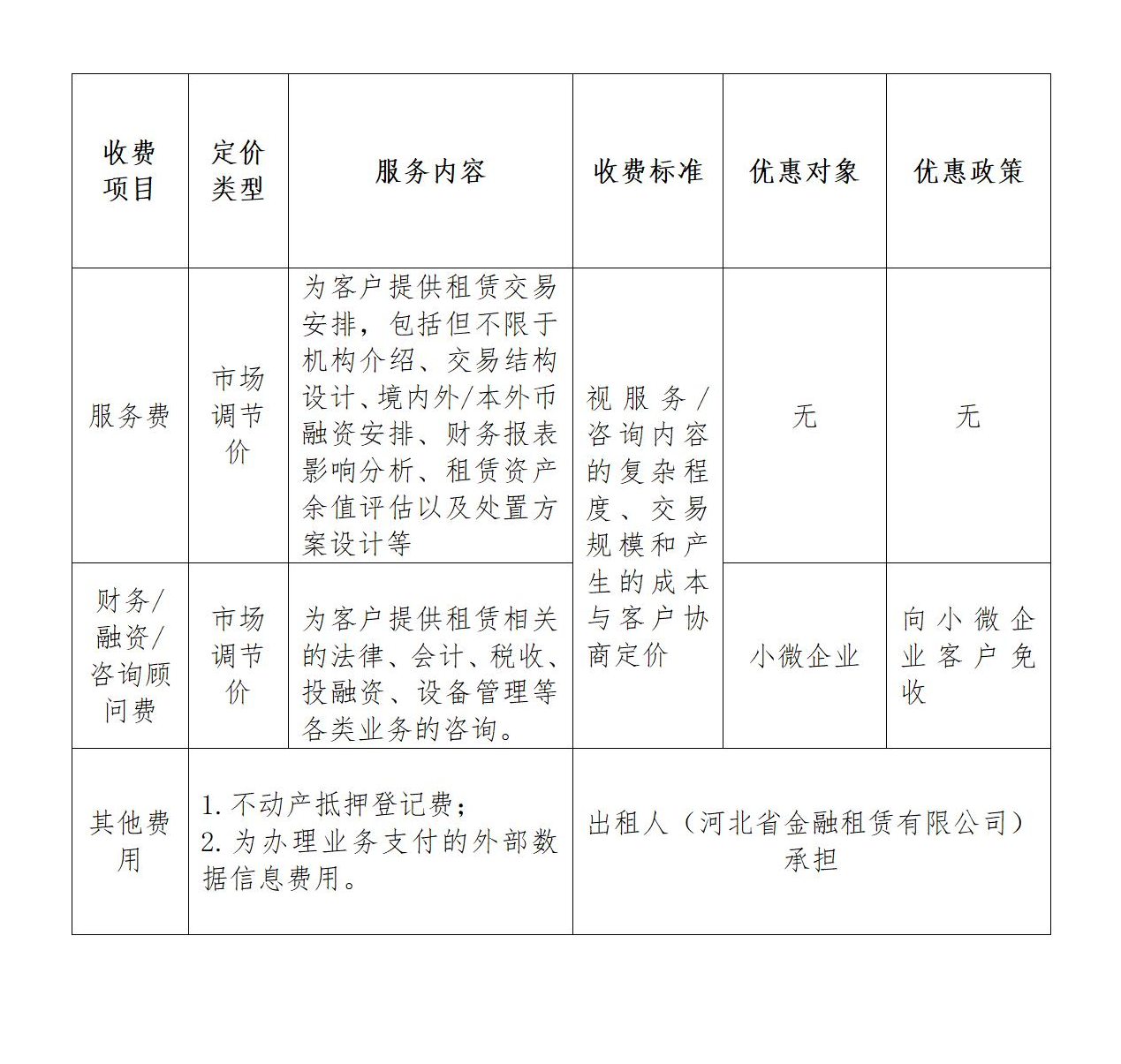 河北省金融租賃有限公司服務價格目錄